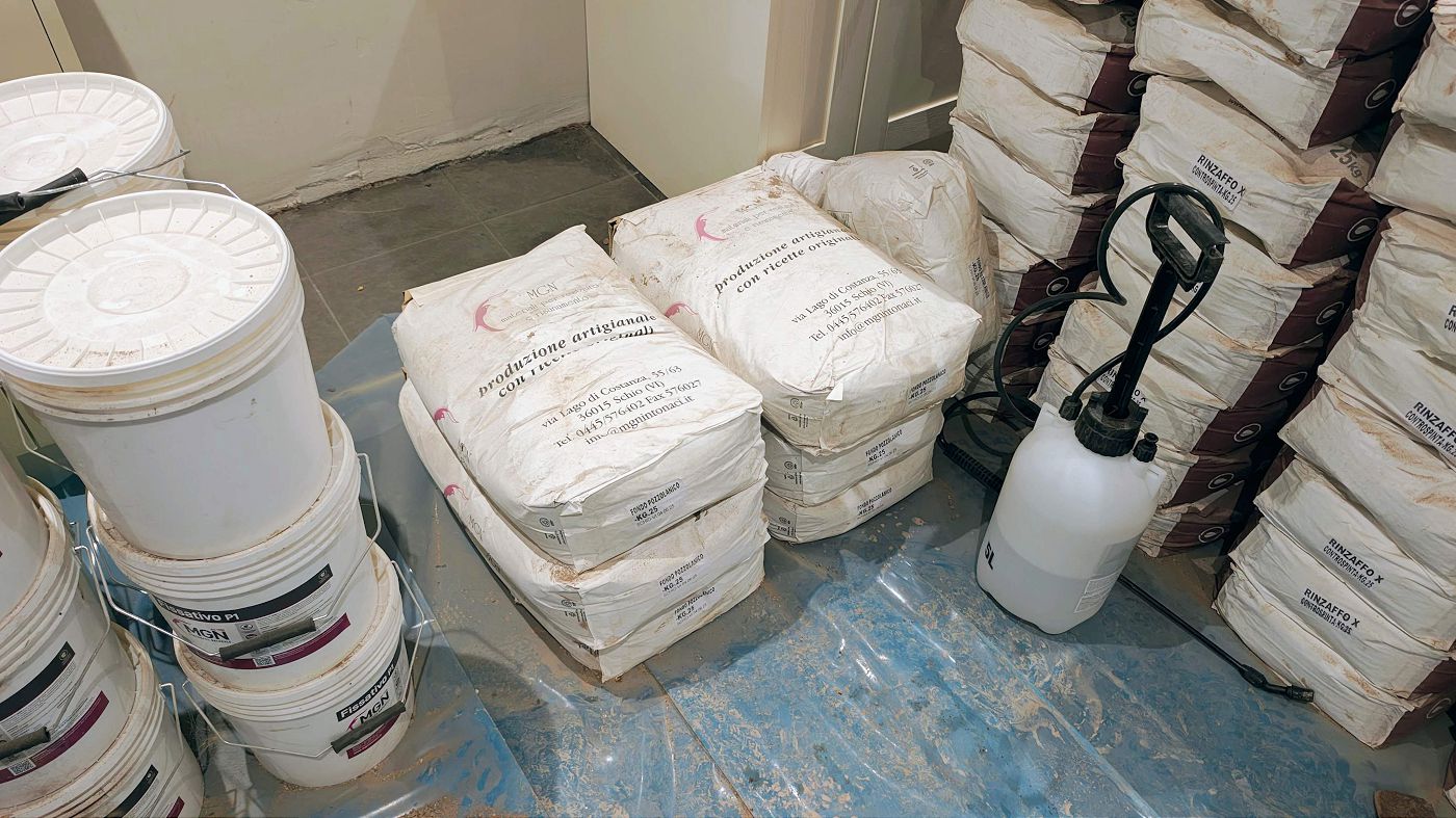 The Rasacol is a heritage-appropriate composite lime mortar, formulated with natural air lime, some hydraulic lime (NHL 3.5), cocciopesto (brick dust) and natural pozzolans. This combination gives it a dual hardening mechanism — hydraulic and pozzolanic — allowing it to gain early strength reliably while remaining vapour-open and compatible with damp historic masonry.