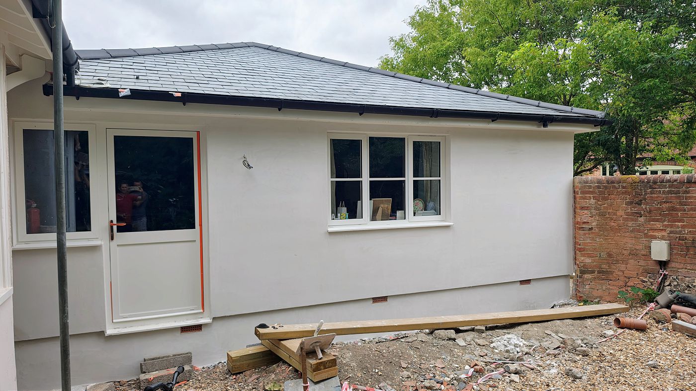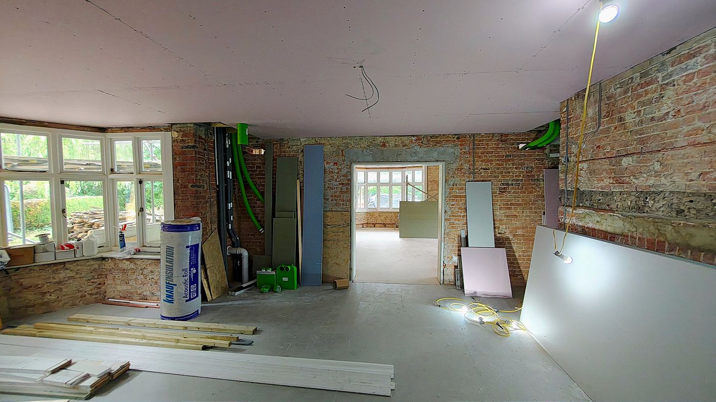 Alongside the refurbishment, a new extension was constructed using modern building methods and insulated with 100 mm of conventional foam insulation, in line with current standards.