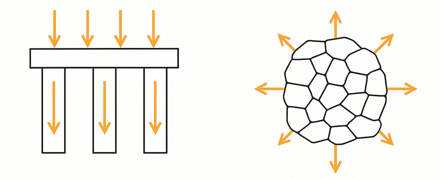 In a point-loaded structure, the material is so stiff that it resists bending or distortion. The weight therefore concentrates at specific points or lines, creating narrow zones of stress. This system is efficient and predictable — ideal for engineered materials that can tolerate enormous compression and tension without deformation. But it is also unforgiving. Because there is no flexibility built into the system, any movement beyond its design limits — settlement, thermal expansion, vibration — results in cracks or structural failure.